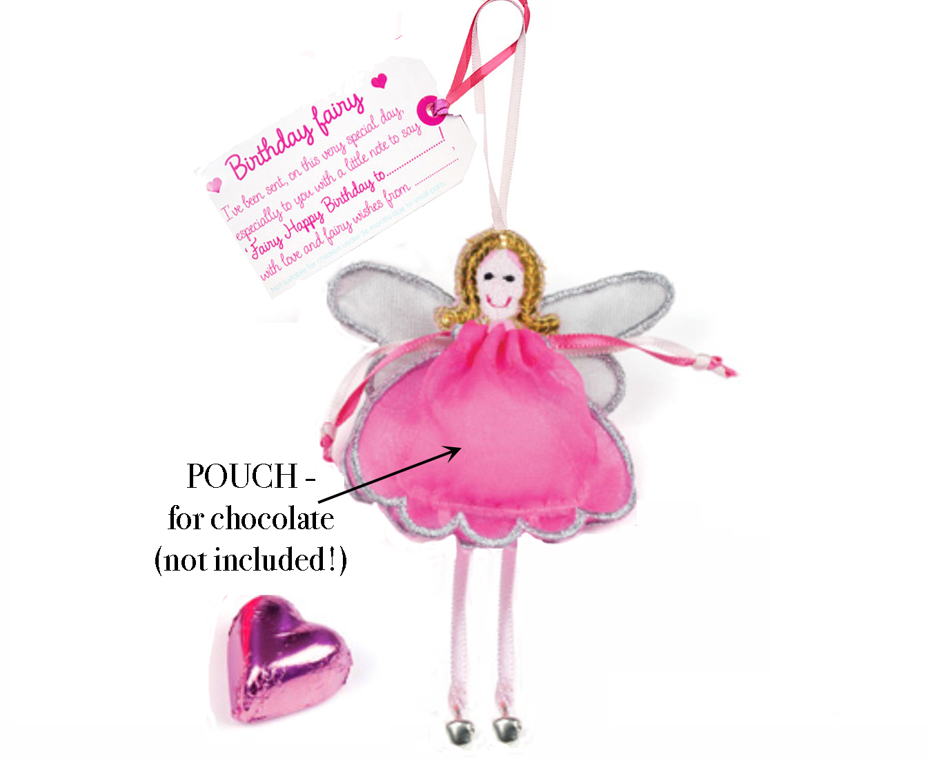 A unique birthday present for all ages who loves fairies! Gorgeous fairy with pink organza dress with a drawstring pouch to pop in a chocolate or gift! She has pink heart sequins, beaded legs and tinkling little bell feet.